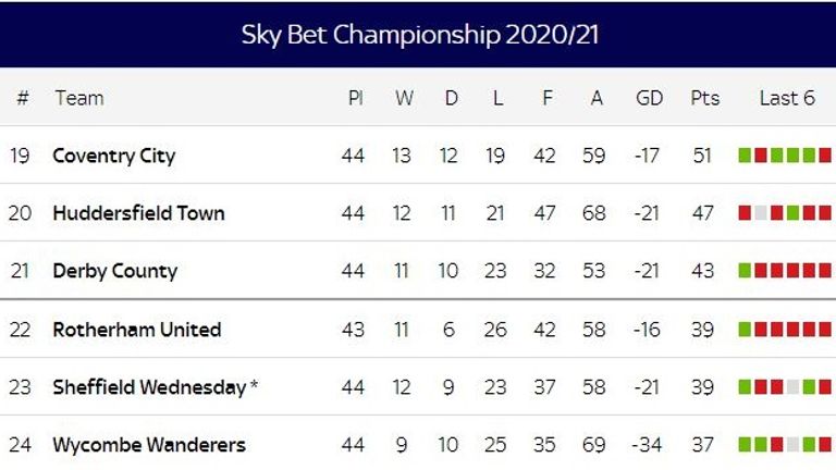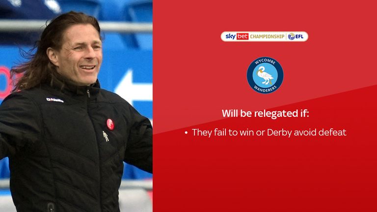 All three relegations from the Championship could be confirmed on Saturday. Wycombe are the most likely. They are six points adrift of safety with a far worse goal difference than Derby in 21st. Anything but a win will guarantee their drop back into League One, while a win wouldn't even be enough if Derby picked up so much as a point against Swansea - live on Sky Sports Football from 2.45pm ahead of a 3pm kick-off.